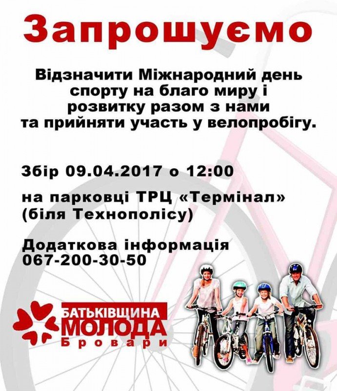 Запрошуємо відзначити Міжнародній день спорту на благо миру і розвитку разом з нами та прийняти участь у велопробігу !
